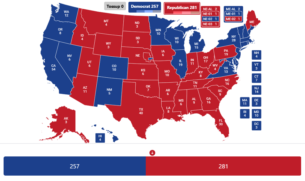 👑 (R) Donald Trump: 281 👑(D) Kamala Harris: 257